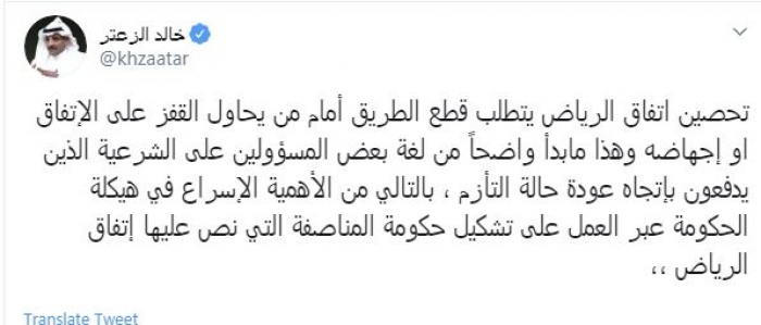 وقال في تغريدة عبر "تويتر" رصدها "المشهد العربي": "تحصين اتفاق الرياض يتطلب قطع الطريق أمام من يحاول القفز على الاتفاق أو إجهاضه وهذا ما بدأ واضحاً من لغة بعض المسؤولين على الشرعية الذين يدفعون باتجاه عودة حالة التأزم".