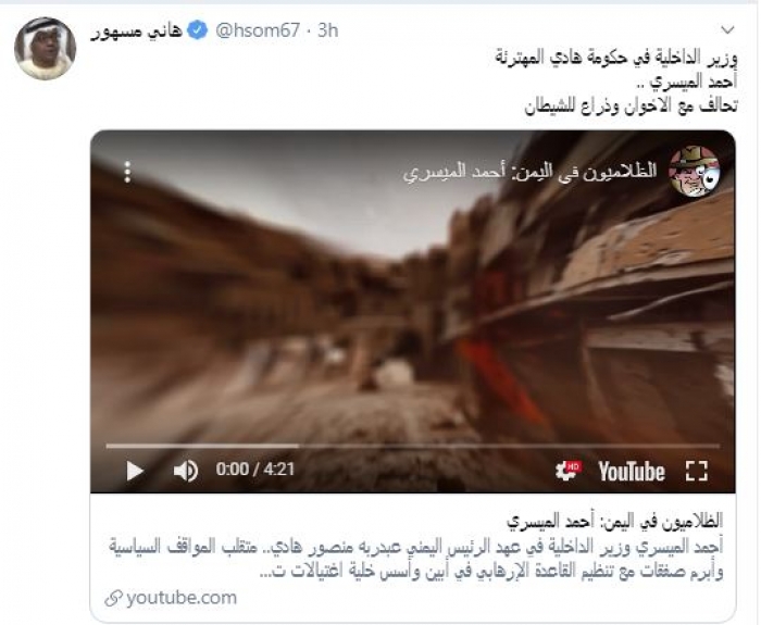 وقال في تغريدة عبر "تويتر" رصدها "المشهد العربي": "وزير الداخلية في حكومة هادي المهترئة أحمد الميسري.. تحالف مع الإخوان وذراع للشيطان".