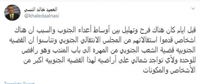 النسي: شعب الجنوب يرفض الوحدة وأي تواجد شمالي على أراضيه
