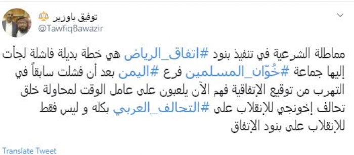 وقال في تغريدة عبر "تويتر" رصدها "المشهد العربي": "مماطلة الشرعية في تنفيذ بنود اتفاق الرياض هي خطة بديلة فاشلة لجأت إليها جماعة الإخُوّان المسلمين فرع اليمن بعد أن فشلت سابقاً في التهرب من توقيع الاتفاقية فهم الآن يلعبون على عامل الوقت لمحاولة خلق تحالف إخونجي للانقلاب على التحالف العربي بكله وليس فقط للانقلاب على بنود الاتفاق".
