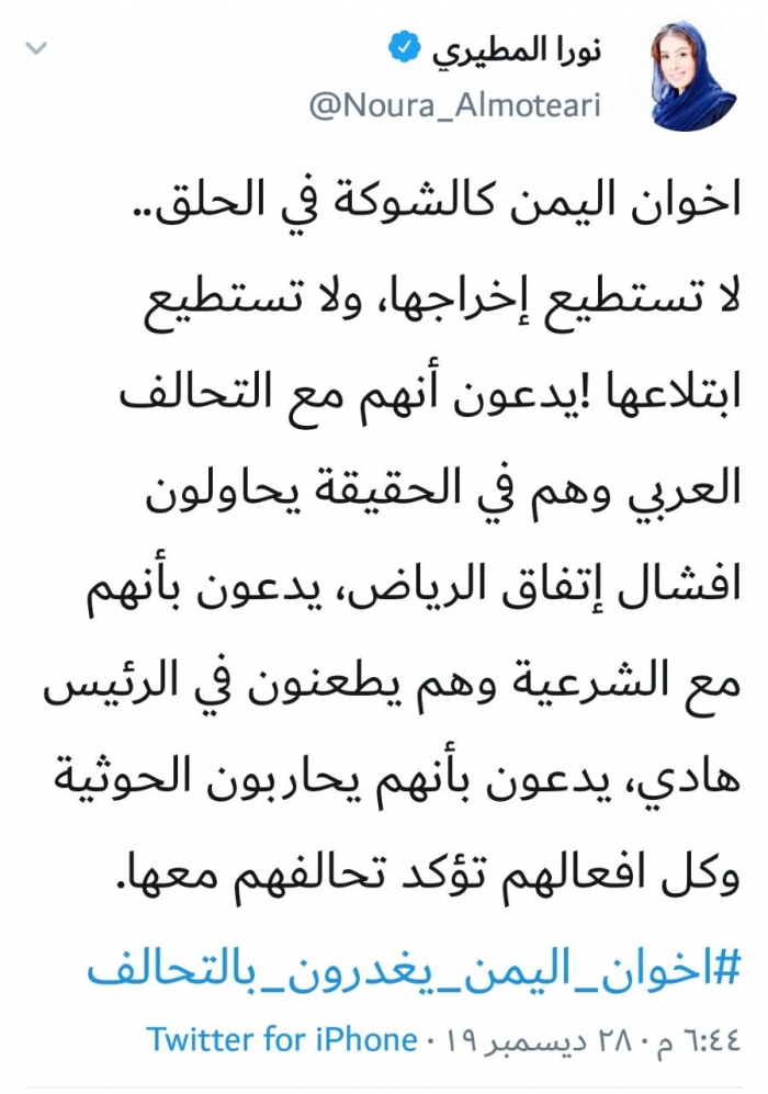 وكتبت "المطيري" في تغريدة عبر حسابها الشخصي بتويتر، رصدها" المشهد العربي" :"إخوان اليمن كالشوكة في الحلق.. لا تستطيع إخراجها، ولا تستطيع ابتلاعها".