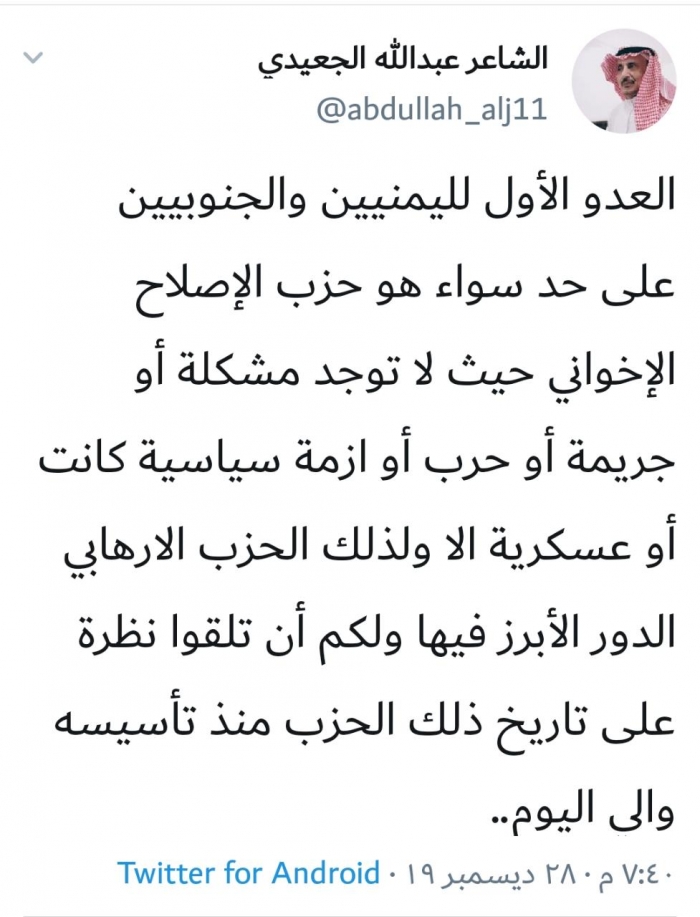 وكتب "الجعيدي" في تغريدة عبر حسابه الشخصي بتويتر، رصدها "المشهد العربي" : "العدو الأول لليمنيين والجنوبيين على حد سواء هو حزب الإصلاح الإخواني حيث لا توجد مشكلة أو جريمة أو حرب أو ازمة سياسية كانت أو عسكرية إلا ولذلك الحزب الإرهابي الدور الأبرز فيها".