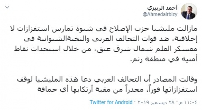 وأضاف: "قالت المصادر أن التحالف العربي دعا هذه المليشيا لوقف استفزازاتها فوراً، محذراً من مقبة أرتكابها أي حماقة".