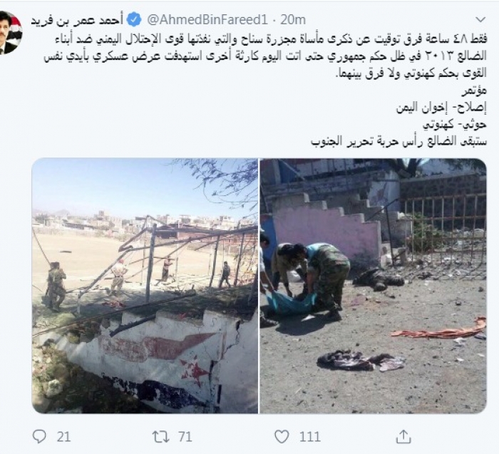 وكتب في تغريدة عبر "تويتر" رصدها "المشهد العربي": "فقط ٤٨ ساعة فرق توقيت عن ذكرى مأساة مجزرة سناح والتي نفذتها قوى الإحتلال اليمني ضد أبناء الضالع ٢٠١٣ في ظل حكم جمهوري حتى اتت اليوم كارثة أخرى استهدفت عرض عسكري بأيدي نفس القوى بحكم كهنوتي ولا فرق بينهما".