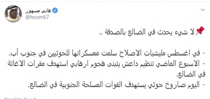 وقال في تغريدة عبر "تويتر" رصدها "المشهد العربي": "لا شيء يحدث في الضالع بالصدفة.. في أغسطس مليشيات الإصلاح سلمت معسكراتها للحوثيين في جنوب إب. الأسبوع الماضي تنظيم داعش يتبنى هجوم إرهابي استهدف مقرات الإغاثة في الضالع. اليوم صاروخ حوثي يستهدف القوات المسلحة الجنوبية في الضالع".