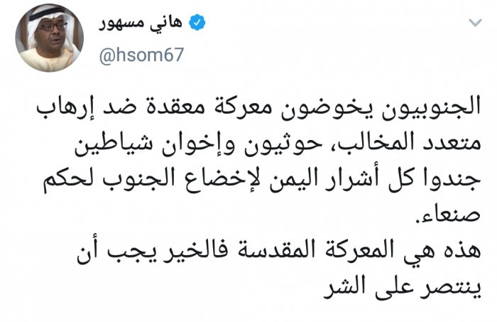 وكتب مسهور، في تغريدة له على موقع التواصل الاجتماعي تويتر، تابعها المشهد العربي: "الجنوبيون يخوضون معركة معقدة ضد إرهاب متعدد المخالب، حوثيون وإخوان شياطين جندوا كل أشرار اليمن لإخضاع الجنوب لحكم صنعاء".