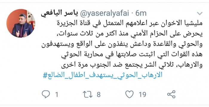 وكتب اليافعي، في تغريدة له على موقع التواصل الاجتماعي تويتر، تابعها المشهد العربي: "مليشيا الإخوان عبر إعلامهم المتمثل في قناة الجزيرة يحرضون على الحزام الأمني منذ أكثر من ثلاث سنوات، والحوثي والقاعدة وداعش ينفذون على الواقع ويستهدفون هذه القوات التي اثبتت صلابتها في محاربة الحوثي والإرهاب".