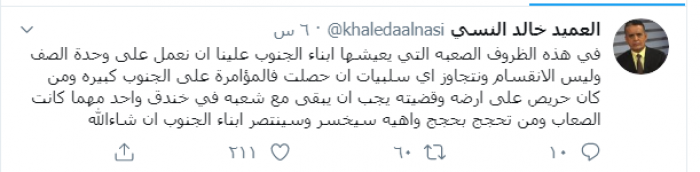 وكتب النسي عبر تغريدة له في "تويتر":"في هذه الظروف الصعبة التي يعيشها أبناء الجنوب علينا أن نعمل على وحدة الصف وليس الانقسام ونتجاوز إي سلبيات إن حصلت".