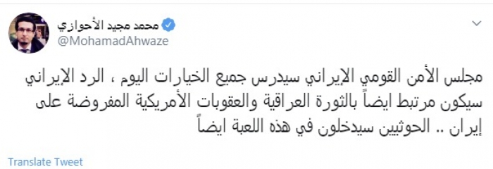 وقال في تغريدة عبر "تويتر" رصدها "المشهد العربي": "مجلس الأمن القومي الإيراني سيدرس جميع الخيارات اليوم، الرد الإيراني سيكون مرتبط أيضاً بالثورة العراقية والعقوبات الأمريكية المفروضة على إيران.. الحوثيين سيدخلون في هذه اللعبة أيضاً".