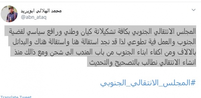 وقال في تغريدة عبر "تويتر" رصدها "المشهد العربي": "المجلس الانتقالي الجنوبي بكافة تشكيلاته كيان وطني ورافع سياسي لقضية الجنوب والعمل فيه تطوعي لذا قد نجد استقالة هنا واستقالة هناك والبدائل بالآلاف ومن أكفأ أبناء الجنوب من باب المندب إلى شحن ومع ذالك منذ إنشاء الانتقالي نطالب بالتصحيح والتحديث".