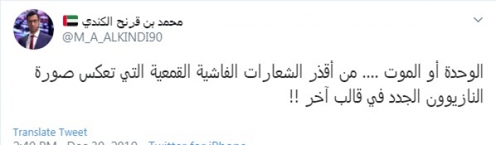 وقال في تغريدة عبر "تويتر" رصدها "المشهد العربي": "الوحدة أو الموت... من أقذر الشعارات الفاشية القمعية التي تعكس صورة النازيون الجدد في قالب آخر".
