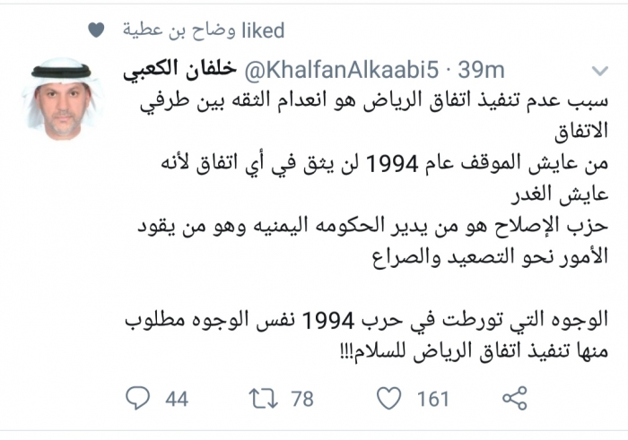 وكتب الكعبي، في تغريدة له على موقع التواصل الاجتماعي تويتر، تابعها المشهد العربي: "سبب عدم تنفيذ اتفاق الرياض هو انعدام الثقة بين طرفي الاتفاق".