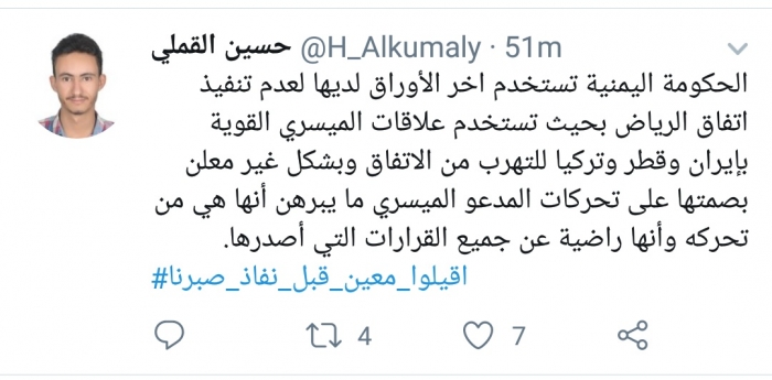 وكتب القملي، في تغريدة له على موقع التواصل الاجتماعي تويتر، تابعها المشهد العربي: "الحكومة اليمنية تستخدم أخر الأوراق لديها لعدم تنفيذ اتفاق الرياض بحيث تستخدم علاقات الميسري القوية بإيران وقطر وتركيا للتهرب من الاتفاق وبشكل غير معلن بصمتها على تحركات المدعو الميسري".