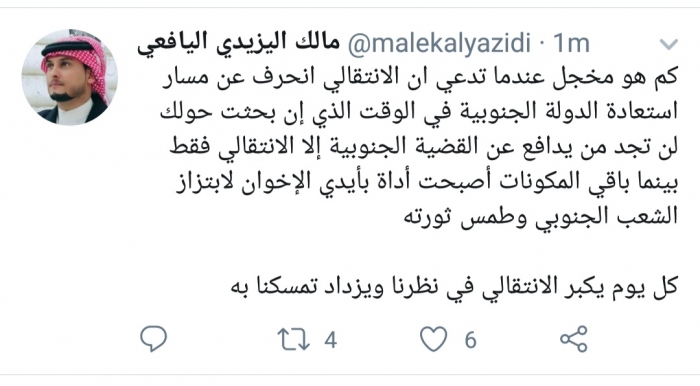 وكتب اليافعي، في تغريدة له على موقع التواصل الاجتماعي تويتر، تابعها المشهد العربي: "كم هو مخجل عندما تدعي أن الانتقالي انحرف عن مسار استعادة الدولة الجنوبية في الوقت الذي إن بحثت حولك لن تجد من يدافع عن القضية الجنوبية إلا الانتقالي فقط".