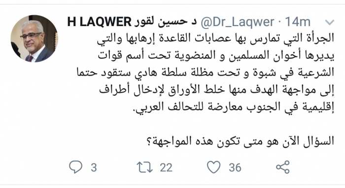 وكتب لقور، في تغريدة له على موقع التواصل الاجتماعي تويتر، تابعها المشهد العربي: "الجرأة التي تمارس بها عصابات القاعدة إرهابها والتي يديرها إخوان المسلمين و المنضوية تحت اسم قوات الشرعية في شبوة وتحت مظلة سلطة هادي ستقود حتما إلى مواجهة الهدف منها خلط الأوراق لإدخال أطراف إقليمية في الجنوب معارضة للتحالف العربي".
