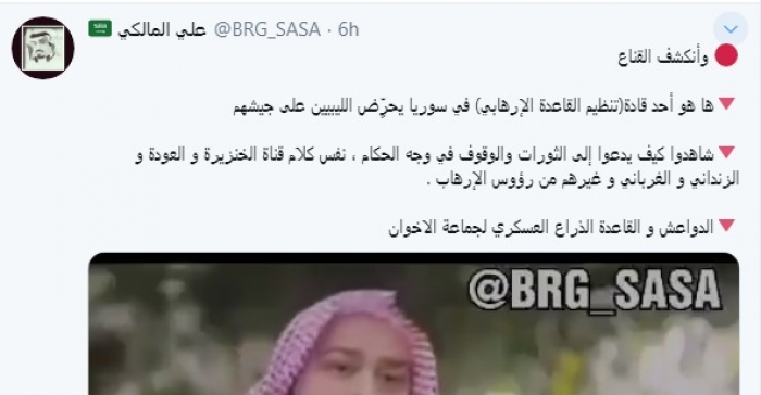 نشر الإعلامي السعودي علي المالكي، اليوم، مقطع فيديو لقيادي سوري بتنظيم القاعدة الإرهابي يُحرضّ الليبيين على الجيش الوطني الليبي، على طريقة القيادي الإخواني عبدالمجيد الزنداني.