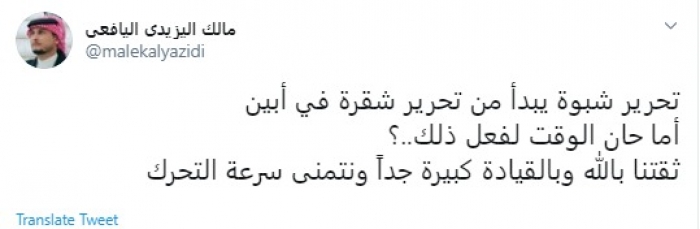 وكتب في تغريدة عبر "تويتر" رصدها "المشهد العربي": "تحرير شبوة يبدأ من تحرير شقرة في أبين أما حان الوقت لفعل ذلك..؟ ثقتنا بالله وبالقيادة كبيرة جداً ونتمنى سرعة التحرك".