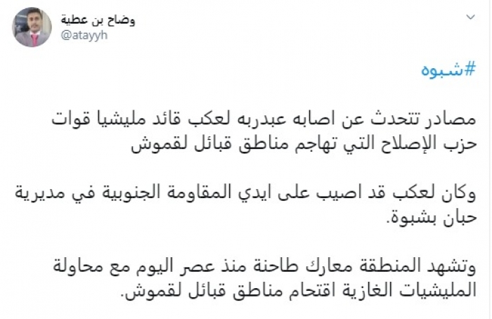 وقال في تغريدة عبر "تويتر" رصدها "المشهد العربي": "شبوة.. مصادر تتحدث عن إصابة عبدربه لعكب قائد مليشيا قوات حزب الإصلاح التي تهاجم مناطق قبائل لقموش وكان لعكب قد أصيب على أيدي المقاومة الجنوبية في مديرية حبان بشبوة".
