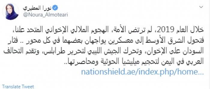 وكتبت في تغريدة عبر "تويتر" رصدها "المشهد العربي": "خلال العام 2019، لم ترتض الأمة، الهجوم الملالي الإخواني المتحد علنا، فتحول الشرق الأوسط إلى معسكرين يواجهان بعضهما في كل محور".