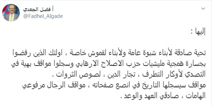 وقال في تغريدة عبر "تويتر" رصدها "المشهد العربي": "تحية صادقة لأبناء شبوة عامة ولأبناء لقموش خاصة، أولئك الذين رفضوا بجسارة همجية مليشيات حزب الإصلاح الارهابي وسجلوا مواقف بهية في التصدي لأوكار التطرف، تجار الدين، لصوص الثروات".