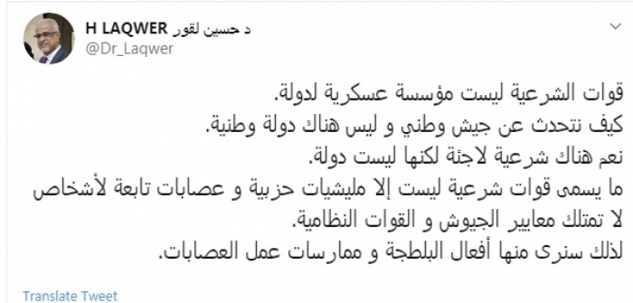 وقال في تغريدة عبر "تويتر" رصدها "المشهد العربي": "قوات الشرعية ليست مؤسسة عسكرية لدولة. كيف نتحدث عن جيش وطني وليس هناك دولة وطنية. نعم هناك شرعية لاجئة لكنها ليست دولة".
