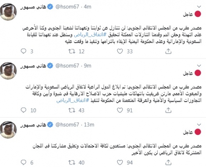 وكتب في سلسلة تغريدات عبر "تويتر" رصدها "المشهد العربي": "مصدر مقرب من المجلس الانتقالي الجنوبي: مستعدون لكافة الاحتمالات وتعليق مشاركتنا في اللجان المشتركة لاتفاق الرياض لن يكون الأخير".