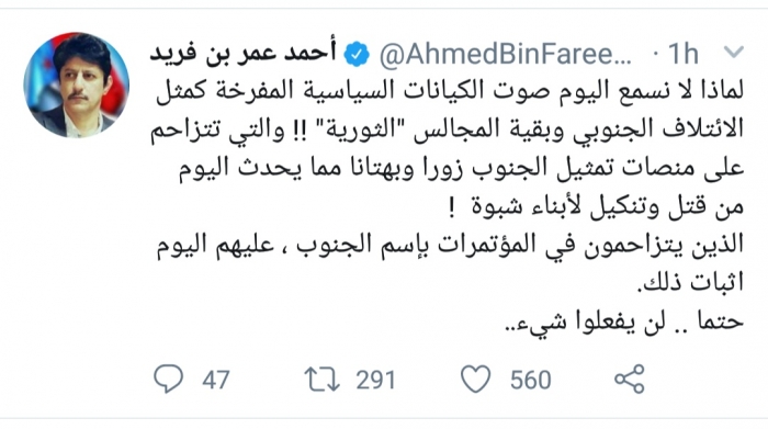 وتابع: "يتزاحمون في المؤتمرات باسم الجنوب، عليهم اليوم إثبات ذلك"، مضيفا: "حتما .. لن يفعلوا شيء".
