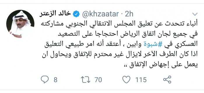 وكتب الزعتر، في تغريدة له عبر موقع التواصل الاجتماعي تويتر، تابعها المشهد العربي: "أنباء تتحدث عن تعليق المجلس الانتقالي الجنوبي مشاركته في جميع لجان اتفاق الرياض احتجاجا على التصعيد العسكري في شبوة وأبين".