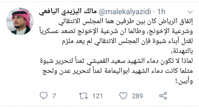 أكد الناشط السياسي مالك اليزيدي اليافعي، أن المجلس الانتقالي الجنوبي غير ملزم بالتهدئة، بعد تصعيد مليشيات الإخوان لقتل أبناء شبوة.