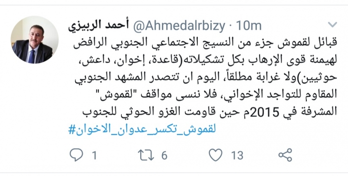 وكتب الربيزي، في تغريدة له عبر موقع التواصل الاجتماعي تويتر، تابعها المشهد العربي: "قبائل لقموش جزء من النسيج الاجتماعي الجنوبي الرافض لهيمنة قوى الإرهاب بكل تشكيلاته (قاعدة، إخوان، داعش، حوثيين)".