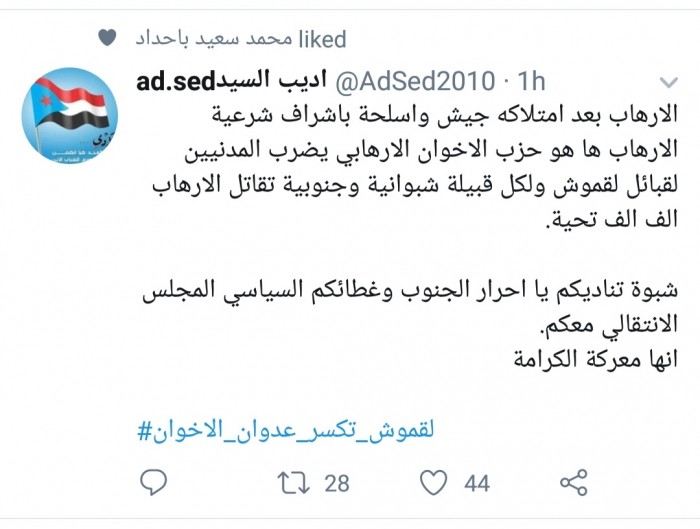 وتابع: "لقبائل لقموش ولكل قبيلة شبوانية وجنوبية تقاتل الإرهاب ألف ألف تحية".