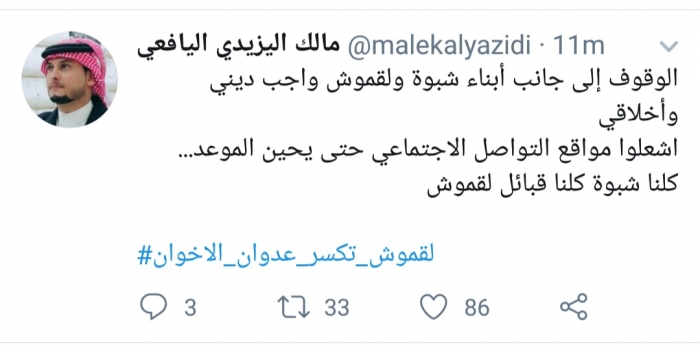 وتابع: "إشعلوا مواقع التواصل الاجتماعي حتى يحين الموعد... كلنا شبوة كلنا قبائل لقموش" .