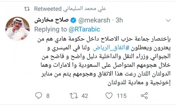 وكتب مخارش، في تغريدة له عبر موقع التواصل الاجتماعي، تويتر، تابعها المشهد العربي: "باختصار جماعة حزب الإصلاح داخل حكومة هادي هم من يعثروا ويعطلوا اتفاق الرياض".