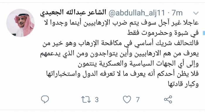 أكد الشاعر عبدالله الجعيدي، أن التحالف العربي سيقضي على الإرهاب نهائيا، ليس فقط في شبوة وحضرموت، بل أينما وجدوا.