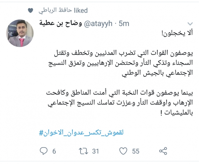 تفاعل عضو الجمعية الوطنية الجنوبية وضاح بن عطية مع هاشتاج "لقموش تكسر عدوان الاخوان".