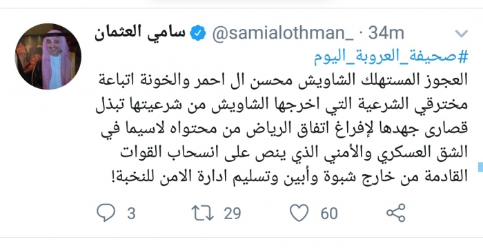 وكتب العثمان، في تغريدة له عبر موقع التواصل الاجتماعي تويتر، تابعها المشهد العربي: "العجوز المستهلك الشاويش محسن آل أحمر والخونة أتباعه مخترقي الشرعية التي أخرجها الشاويش من شرعيتها تبذل قصارى جهدها لإفراغ اتفاق الرياض من محتواه لاسيما في الشق العسكري والأمني الذي ينص على انسحاب القوات القادمة من خارج شبوة وأبين وتسليم إدارة الأمن للنخبة".