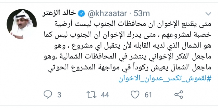 وكتب الزعتر، في تغريدة له عبر موقع التواصل الاجتماعي تويتر، تابعها المشهد العربي: "متى يقتنع الإخوان أن محافظات الجنوب ليست أرضية خصبة لمشروعهم؟".