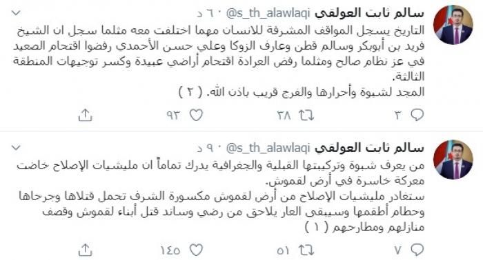 وكتب العولقي عبر سلسلة تغريدات في "تويتر":" من يعرف شبوة وتركيبتها القبلية والجغرافية يدرك تماماً ان مليشيات الإصلاح خاضت معركة خاسرة في أرض لقموش".
