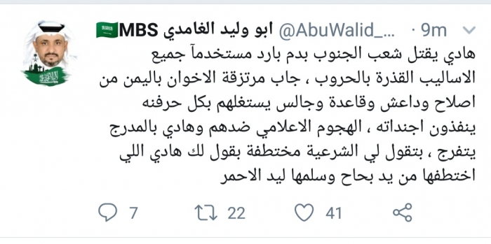 وكتب الغامدي، في تغريدة له عبر موقع التواصل الاجتماعي تويتر، تابعها المشهد العربي: "هادي يقتل شعب الجنوب بدم بارد مستخدماً جميع الأساليب القذرة بالحروب".
