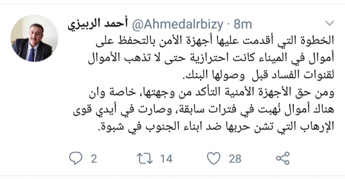 وكتب الربيزي، في تغريدة له عبر موقع التواصل الاجتماعي تويتر، تابعها المشهد العربي: "الخطوة التي أقدمت عليها أجهزة الأمن بالتحفظ على أموال في الميناء كانت احترازية حتى لا تذهب الأموال لقنوات الفساد قبل وصولها البنك".