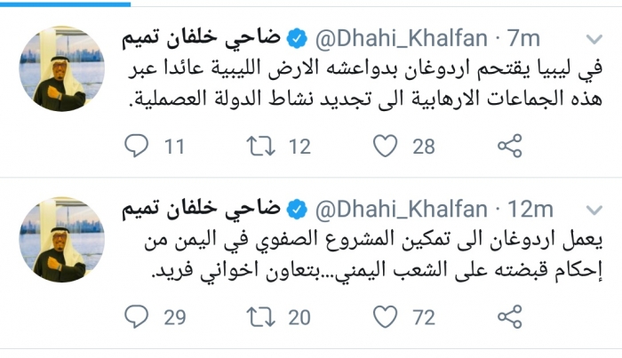 وتابع في تغريدة أخرى: "في ليبيا يقتحم أردوغان بدواعشه الأرض الليبية عائدا عبر هذه الجماعات الإهابية إلى تجديد نشاط الدولة العصملية".