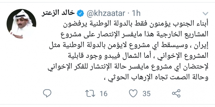 وكتب الزعتر، في تغريدة له عبر موقع التواصل الاجتماعي تويتر، تابعها المشهد العربي: " أبناء الجنوب يؤمنون فقط بالدولة الوطنية يرفضون المشاريع الخارجية وهذا مايفسر الاتتصار على مشروع إيران".
