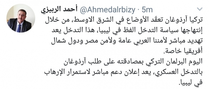 وأضاف: "اليوم البرلمان التركي بمصادقته على طلب أردوغان بالتدخل العسكري، يعد إعلان دعم مباشر لاستمرار الإرهاب في ليبيا".