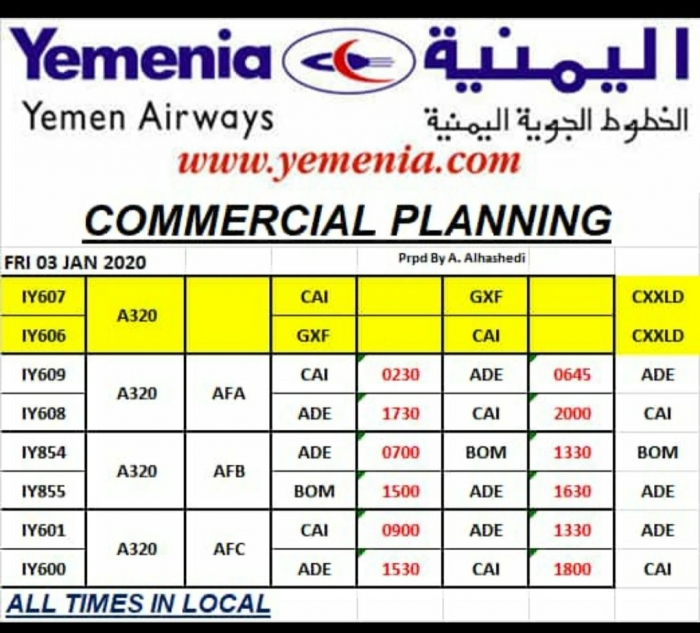 تعتزم شركة طيران اليمنية، تشغيل 6 رحلات جوية، غدا الجمعة، تنطلق جميعها من وإلى مطار العاصمة عدن، كالتالي: