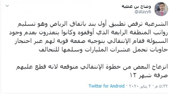 وكتب " بن عطية" في تغريدة عبر حسابه بتويتر، رصدها "المشهد العربي" قال فيها: "الشرعية ترفض تطبيق أول بند باتفاق الرياض وهو تسليم رواتب المنطقة الرابعة الذي أوقفوه وكانوا يتعذرون بعدم وجود السيولة فقام الإنتقالي بتوجيه صفعة قوية لهم عبر احتجاز حاويات تحمل عشرات المليارات وسلمها للتحالف".