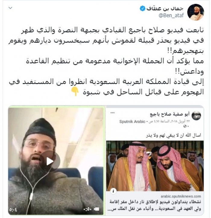 وكتب " بن عطاف" في تغريدة عبر حسابه الشخصي بتويتر، رصدها المشهد العربي: "تابعت فيديو صلاح باجبع القيادي بجبهة النصرة والذي ظهر في فيديو يحذر قبيلة لقموش بأنهم سيخسرون ديارهم ويقوم بتهجيرهم".