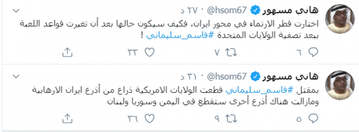 وكتب مسهور عبر "تويتر":"بمقتل قاسم سليماني قطعت الولايات الأمريكية ذراع من أذرع إيران الإرهابية ومازالت هناك أذرع أخرى ستقطع في اليمن وسوريا ولبنان".