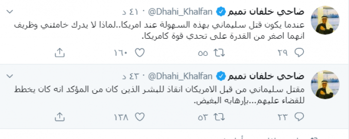 وكتب خلفان عبر "تويتر":" مقتل سليماني من قبل الأمريكان إنقاذ للبشر الذين كان من المؤكد انه كان يخطط للقضاء عليهم...بإرهابه البغيض".