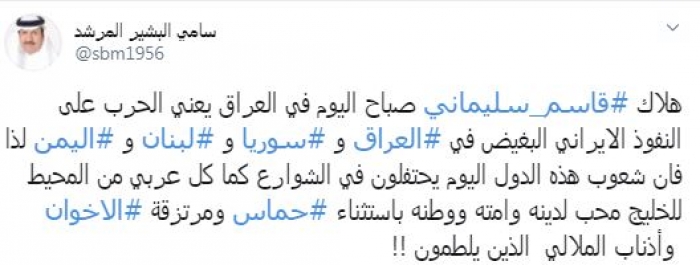 وقال في تغريدة عبر "تويتر" رصدها "المشهد العربي": "هلاك قاسم سليماني صباح اليوم في العراق يعني الحرب على النفوذ الإيراني البغيض في العراق وسوريا ولبنان واليمن لذا فإن شعوب هذه الدول اليوم يحتفلون في الشوارع كما كل عربي من المحيط للخليج محب لدينه وأمته ووطنه باستثناء حماس ومرتزقة الإخوان وأذناب الملالي الذين يلطمون".