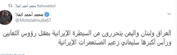 أكد الإعلامي الكويتي محمد أحمد الملا، اليوم، أن العراق ولبنان واليمن سيتحررون من السيطرة الإيرانية وذلك عقب مقتل قائد فيلق القدس الإيراني قاسم سليماني.